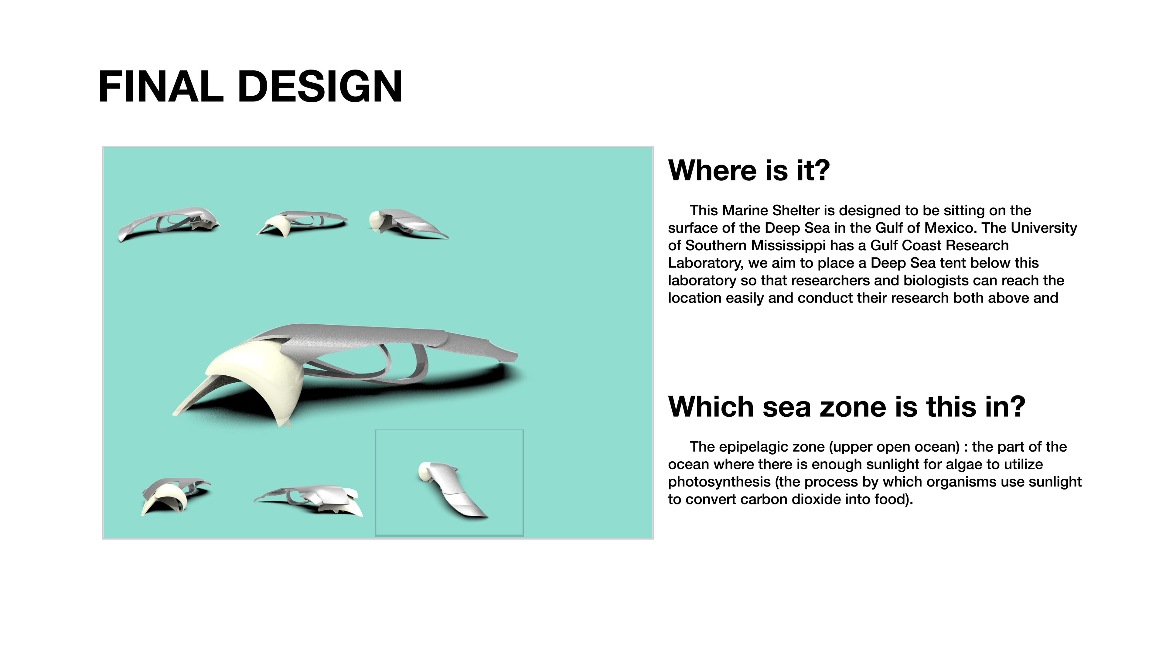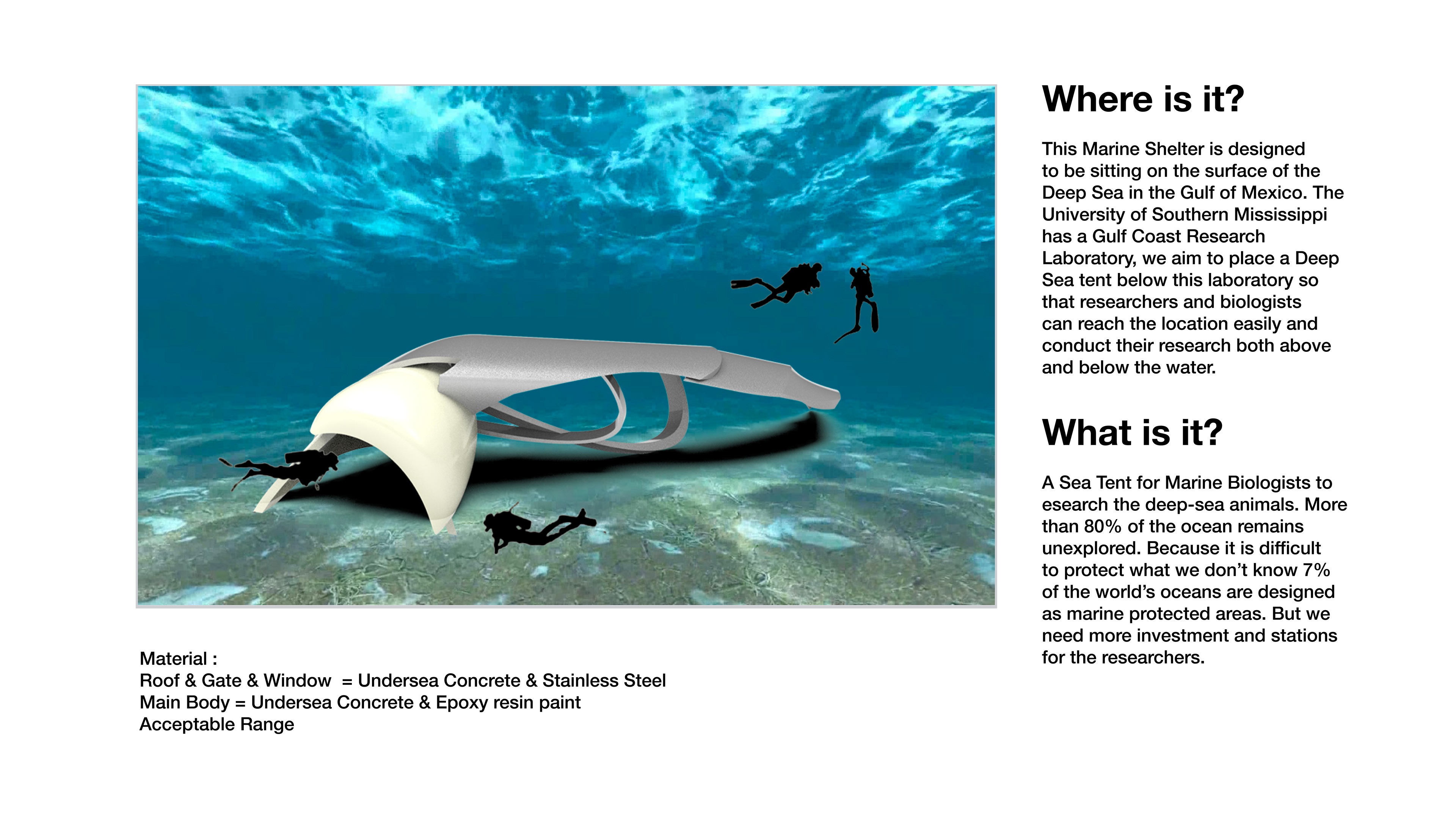 With the research of marine science, I made a marine tent where Marine biologists can gather information. Also i research the growing seaweed and coral reefs to support this tent.